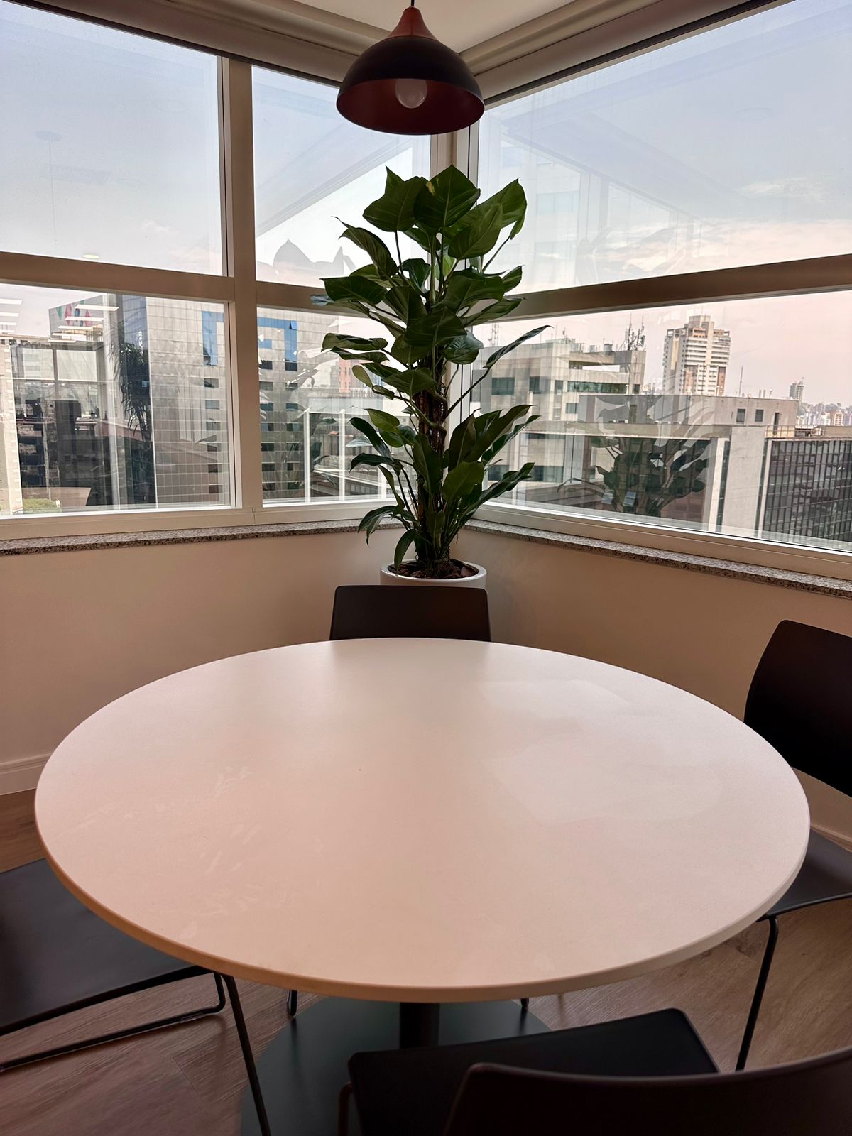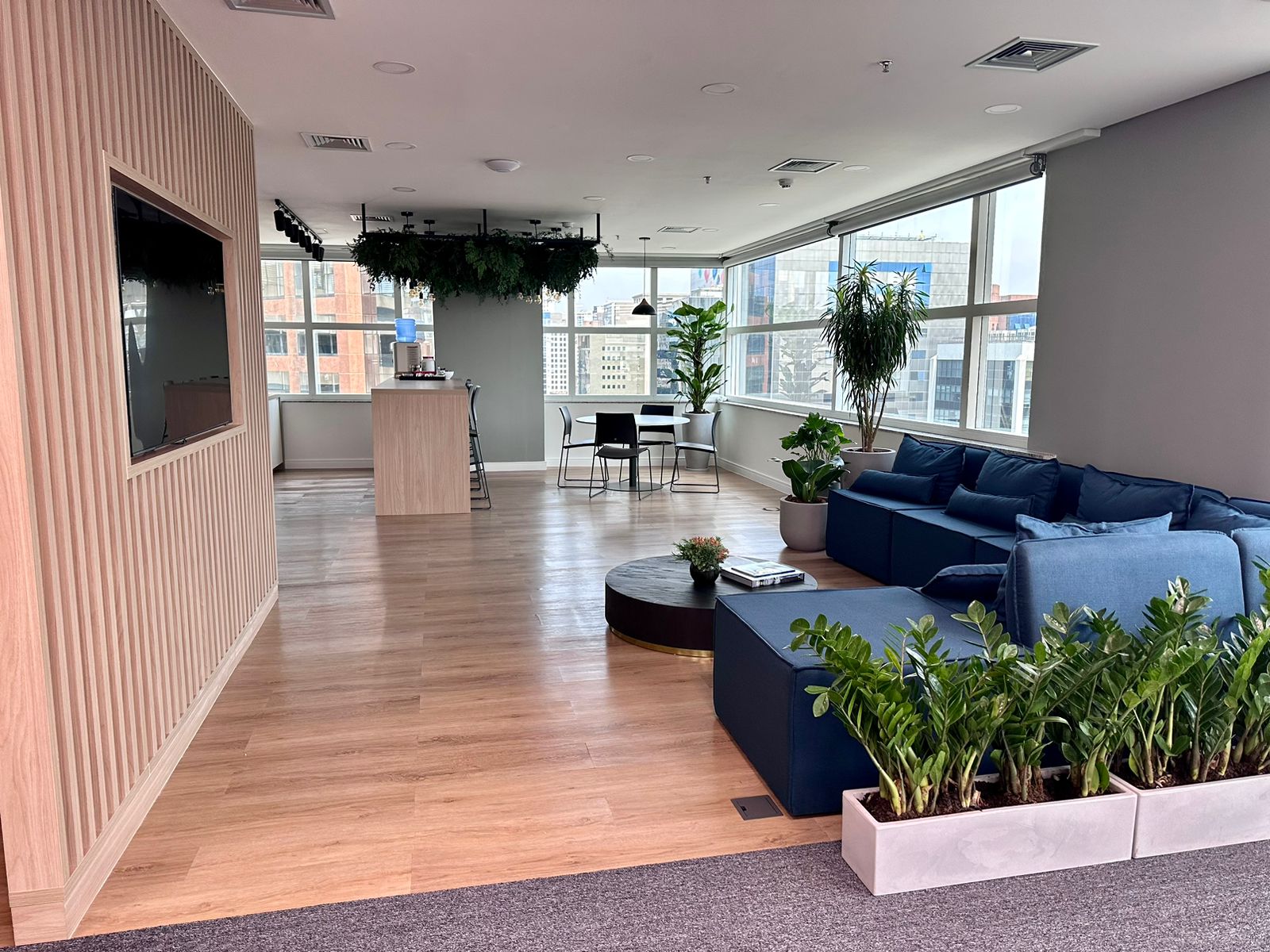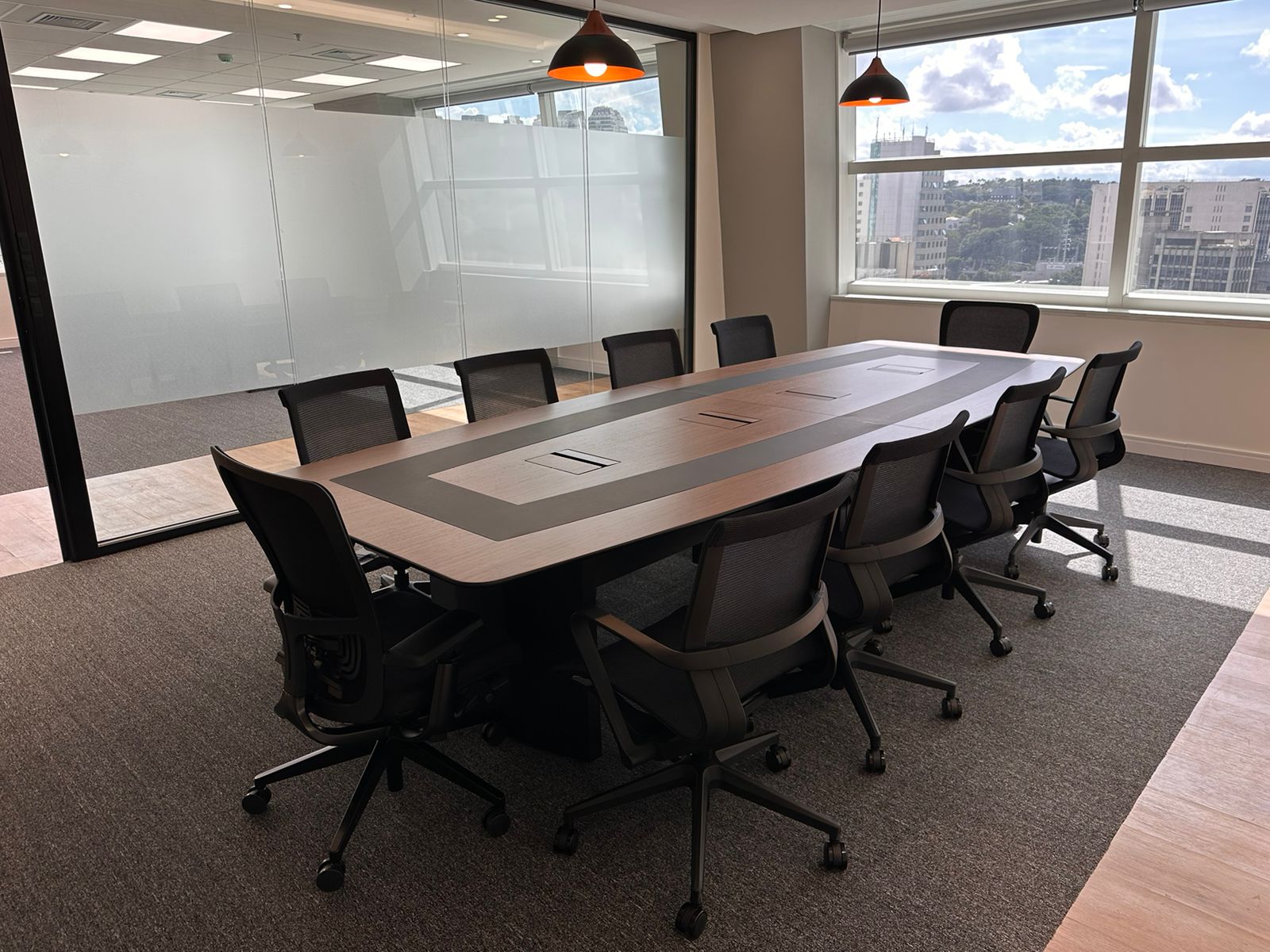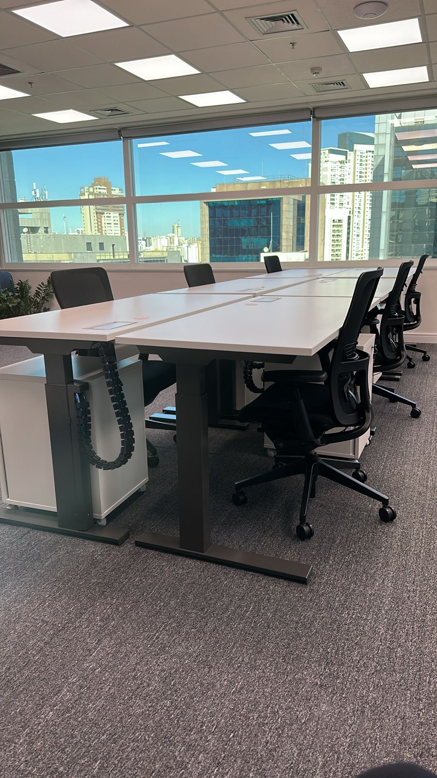 Para as estações de trabalho, escolhemos a Haworth Zody, uma cadeira de alto desempenho importada dos Estados Unidos, garantindo conforto e ergonomia para toda a equipe. Todas as estações são equipadas com regulagem de altura elétrica e mecanismo de tecnologia alemã.