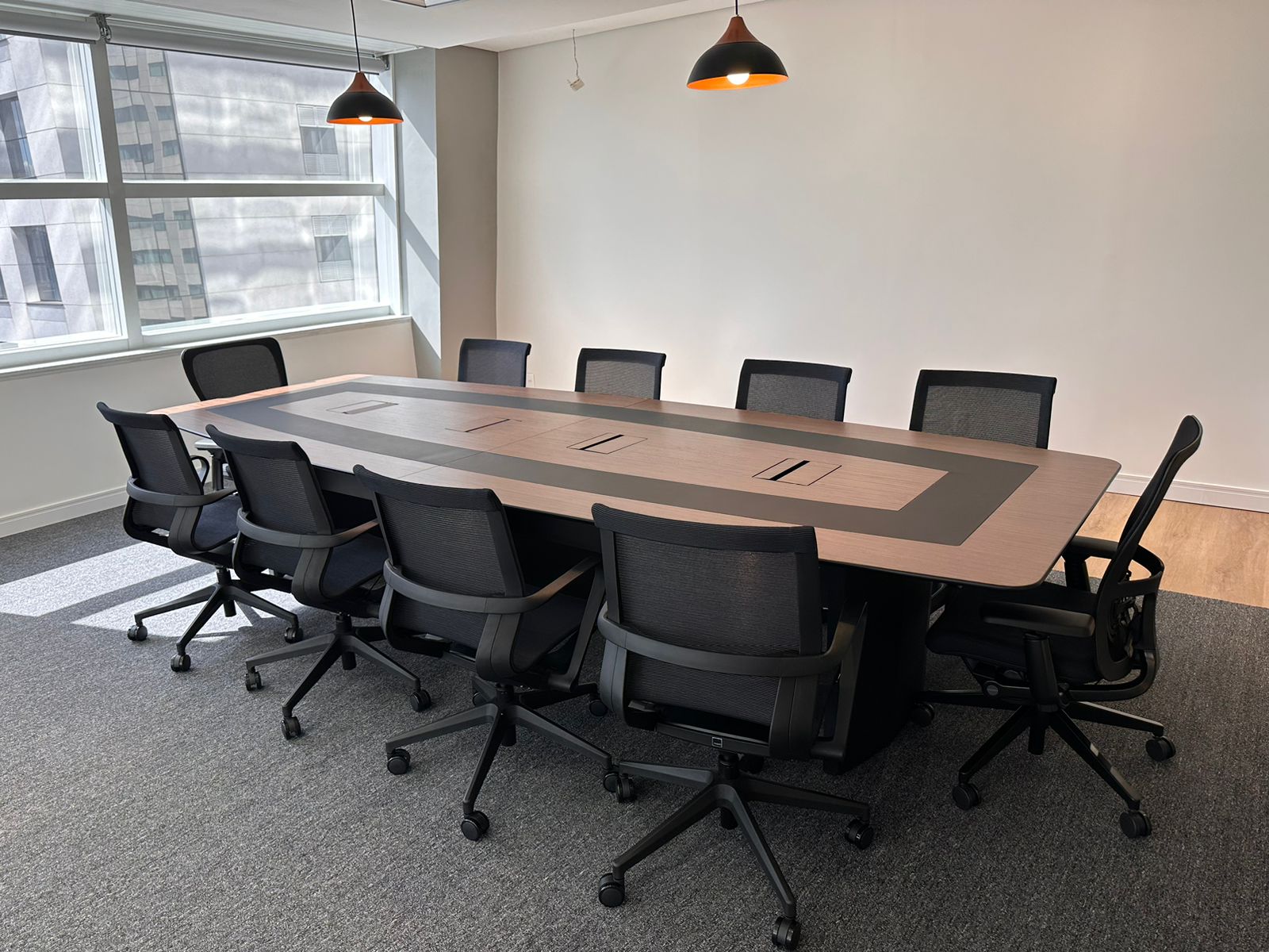 A sala de reuniões é coroada por uma deslumbrante mesa confeccionada em lâmina de madeira natural. O design funcional inclui uma caixa de tomadas embutida com tampa de madeira, e os pés foram elegantemente revestidos em couro. Para complementar, selecionamos uma cadeira com design premiado, totalmente em tela, unindo estética e leveza.