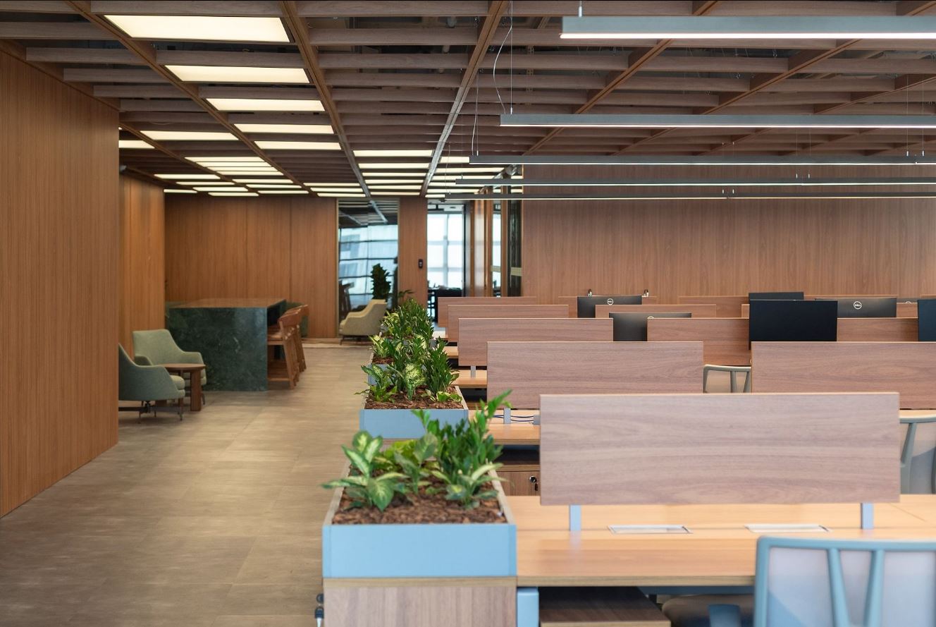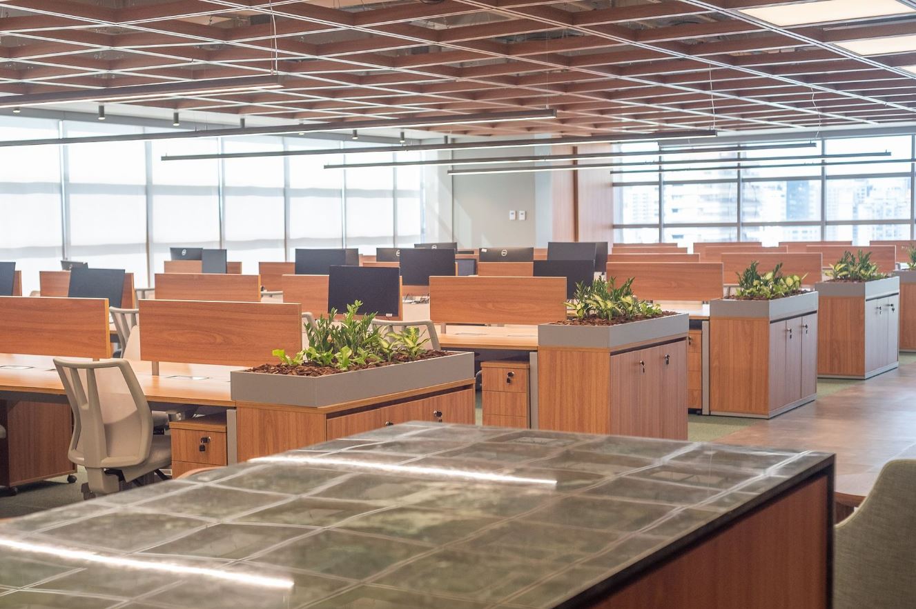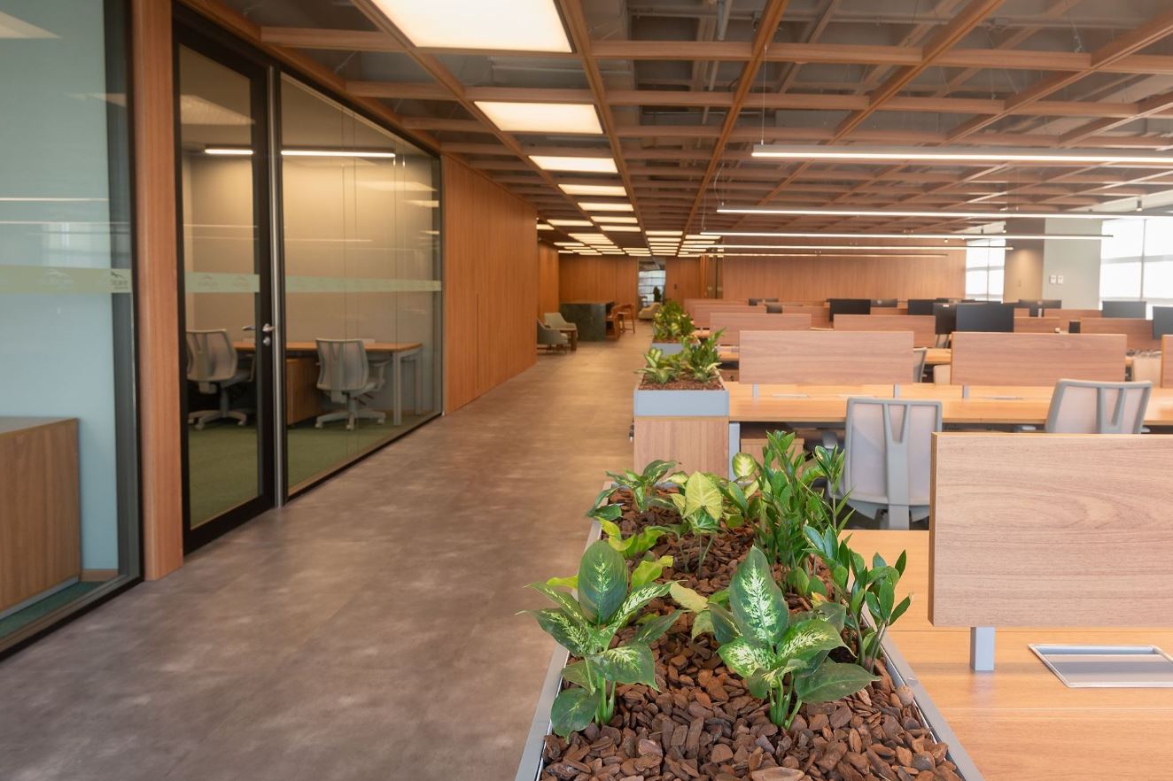 Estações de Trabalho: Utilização das plataformas da linha OP1, complementadas por cachepots para integração de plantas naturais.