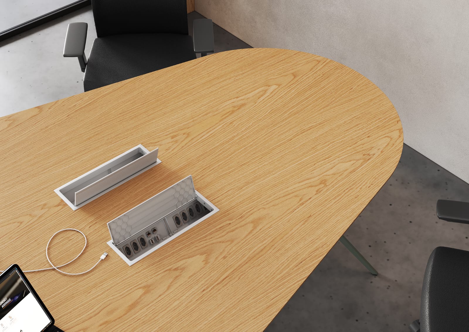 • Tecnologia Invisível: Sistema de conectividade integrado com caixas de aço ou madeira e shaft vertical para gestão inteligente de cabos.